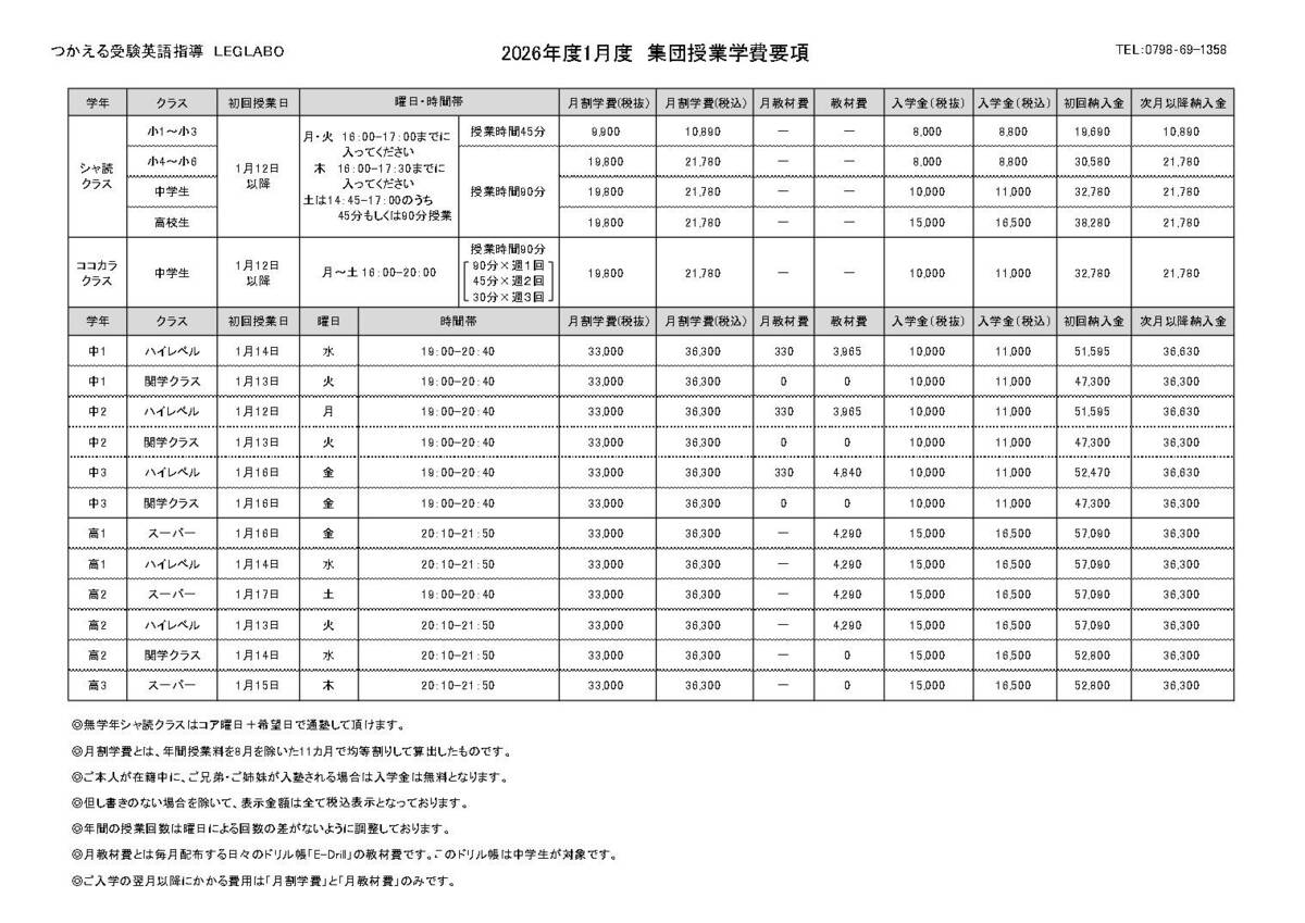 1月学費要項(集団指導)
