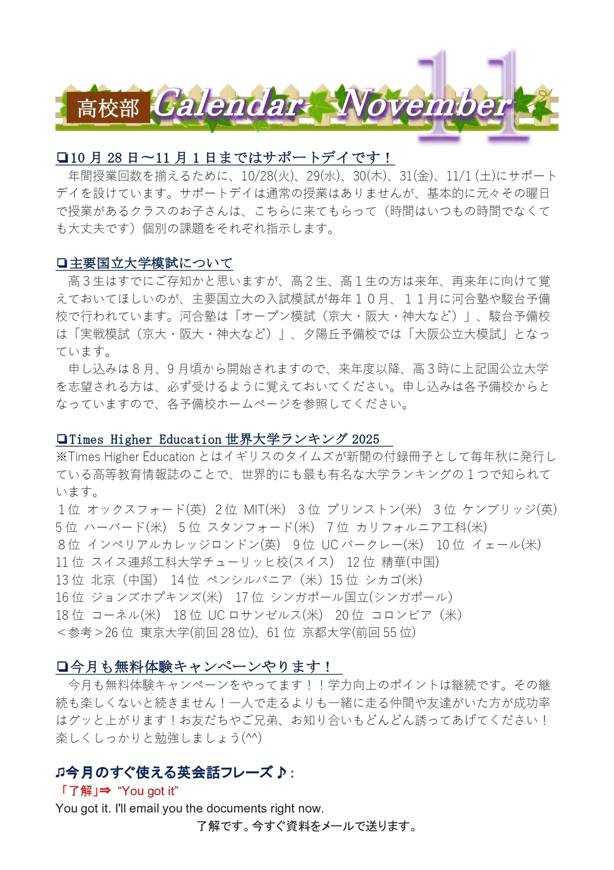 月間予定表 : 高校部